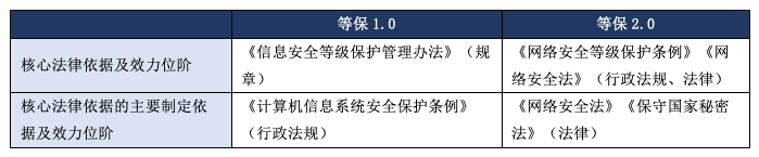 《中華人民共和國網絡安全法》明確規(guī)定“國家實行網絡安全等級保護制度“,相關法律條文和標準也需保持一致性,“等保2.0”將原標準的“信息系統(tǒng)安全等級保護”改為“網絡安全等級保護”,例如《信息系統(tǒng)安全等級保護基本要求》改為《網絡安全等級保護基本要求》。