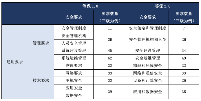 從定級備案等五個規(guī)范性動作到進一步強化具體安全保護措施的落實,保護要求不斷增強。技術標準分為《基本要求》《測評要求》《安全設計技術要求》2.0國家標準,增加新技術新應用安全保護要求。等保2.0通過對原有標準的重新合并整合后有所縮減,以三級為例,管理要求和技術要求內容和數量的變化: